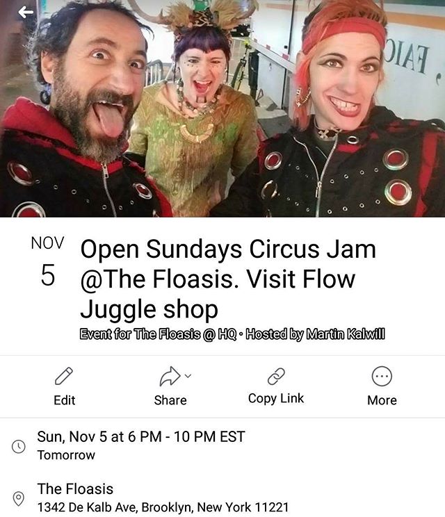 GRAB YOUR TOYS AND GET YOUR FLOW ON! Juggle, Hoop, Spin Burn! Circus Jam every Sunday from 6 to 10:00 p.m.1342B DeKalb Ave